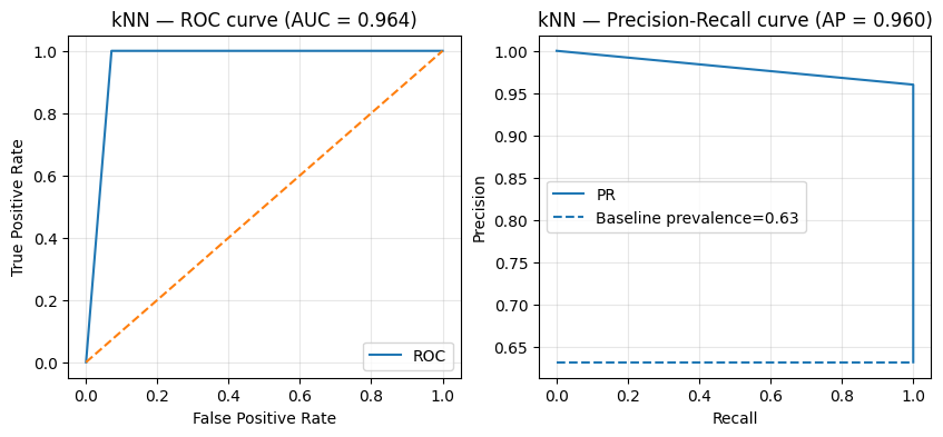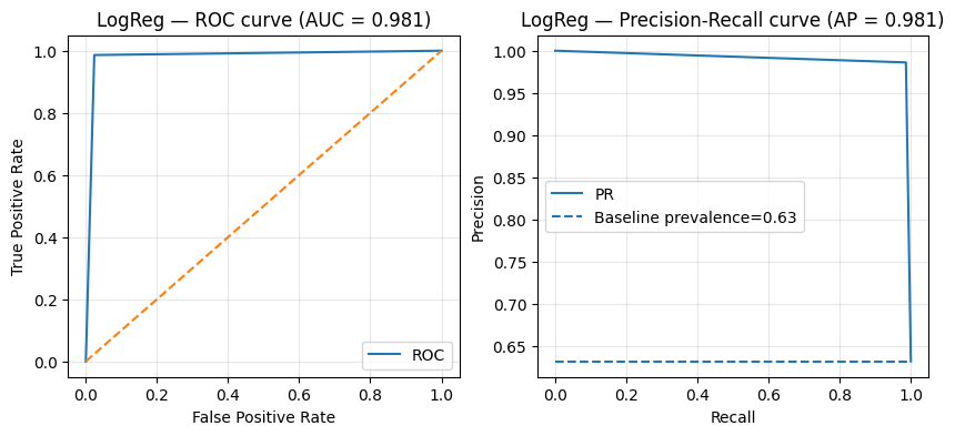 models = [ ("LogReg", best_lr), ("kNN", best_knn)]for name, model in models: model.fit(X_train, y_train) y_pred = model.predict(X_test) acc, fbeta = evaluate_metrics(y_test, y_pred)print(f"{name} — Test metrics")print(f"Accuracy: {acc:.3f}")print(f"F2 score: {fbeta:.3f}") plot_roc_pr(y_test, y_pred, title_prefix=name)